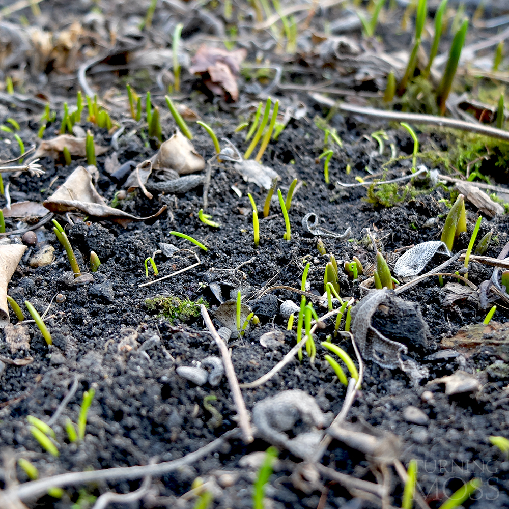 Even if I skipped the spring cleaning, the plants would find their way through the debris. But with just a little bit of help clearing out the old, these small sprouts will have a much easier time growing up. Here is a whole bunch of Glory of the Snow ‘Chionodoxa’ sprouts that were uncovered.