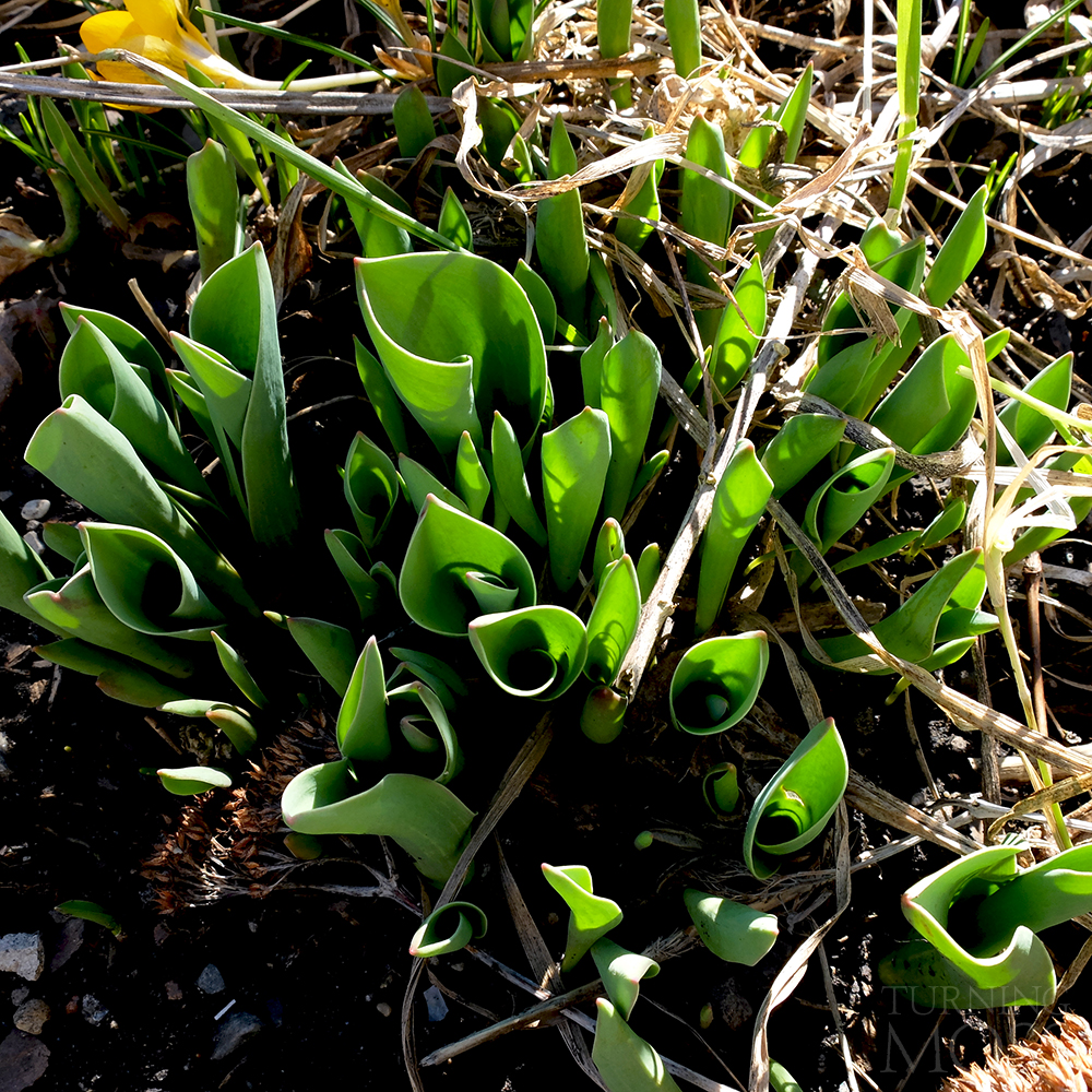 The tulips started to come up early in the month as well, but it’ll be a several week wait until we actually see any flowers. The Tulips in our yard are a very deep purple, almost black. Very pretty. Each year that we’ve lived with this garden, these tulips seem to get a little brighter – they seem to show more of a reddish hue as they age. Over the years, I’ve noticed color changes in several plants. I’m guessing it has to do with nutrients or lack of nutrients in the soil… or maybe it is something that naturally evolves as bulb flowers get older. Interesting to witness, intrigued to learn more about these changes.