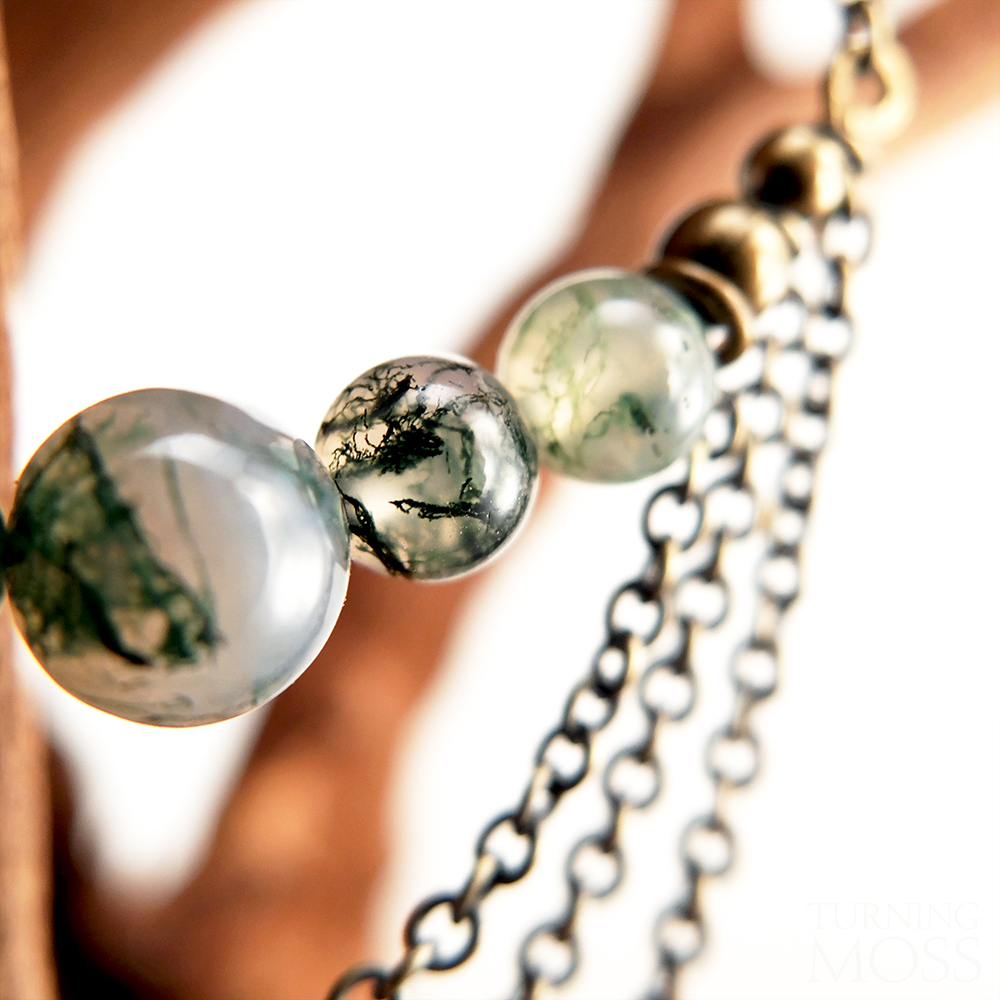 ^ Moss Agate beads detail of mossy inclusions, from a necklace from Walton Collection